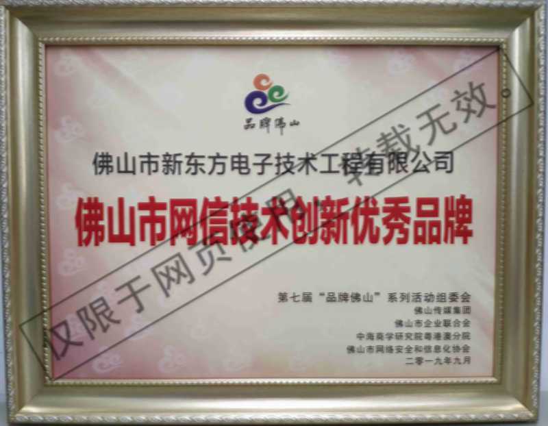 佛山市網信技術創新優秀品牌牌匾(2019年)