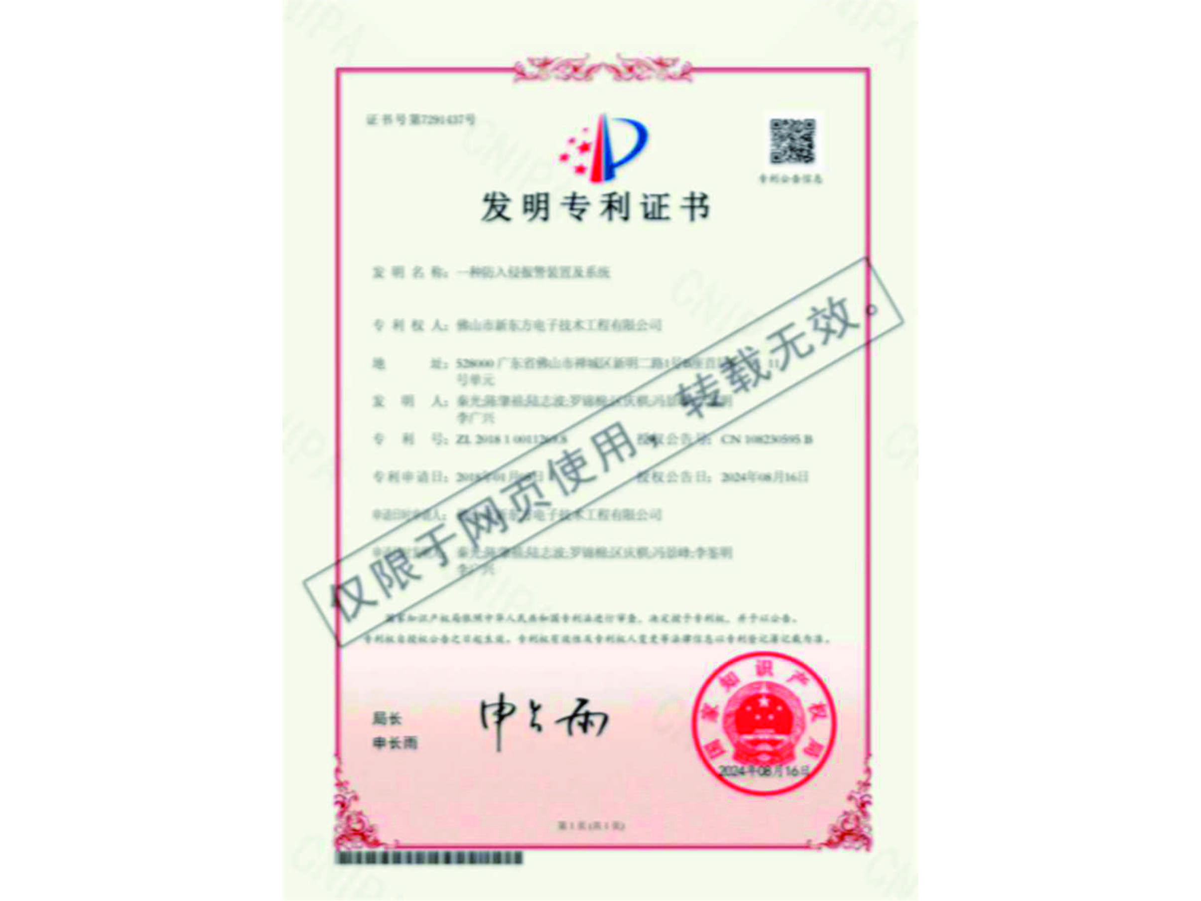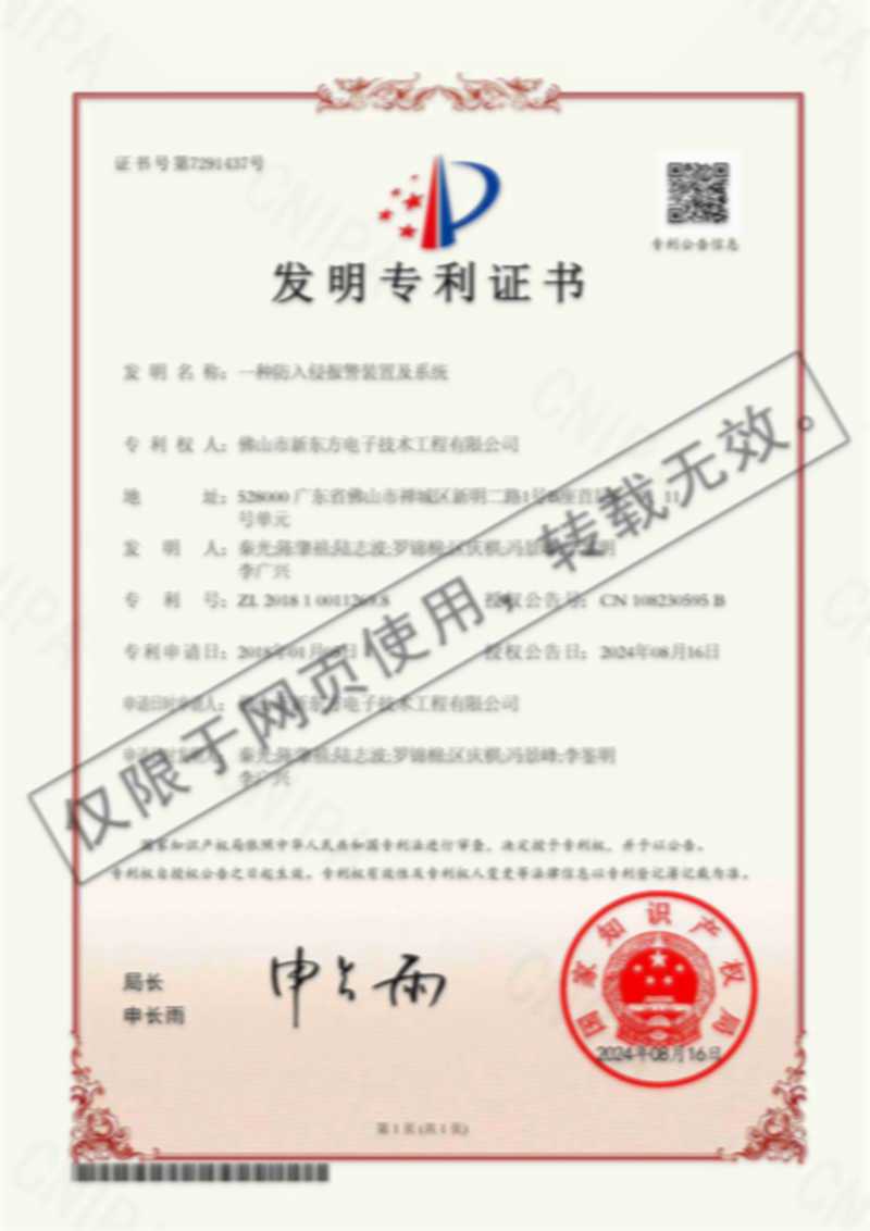 發明專利證書(一種防入侵報警裝置及系統)