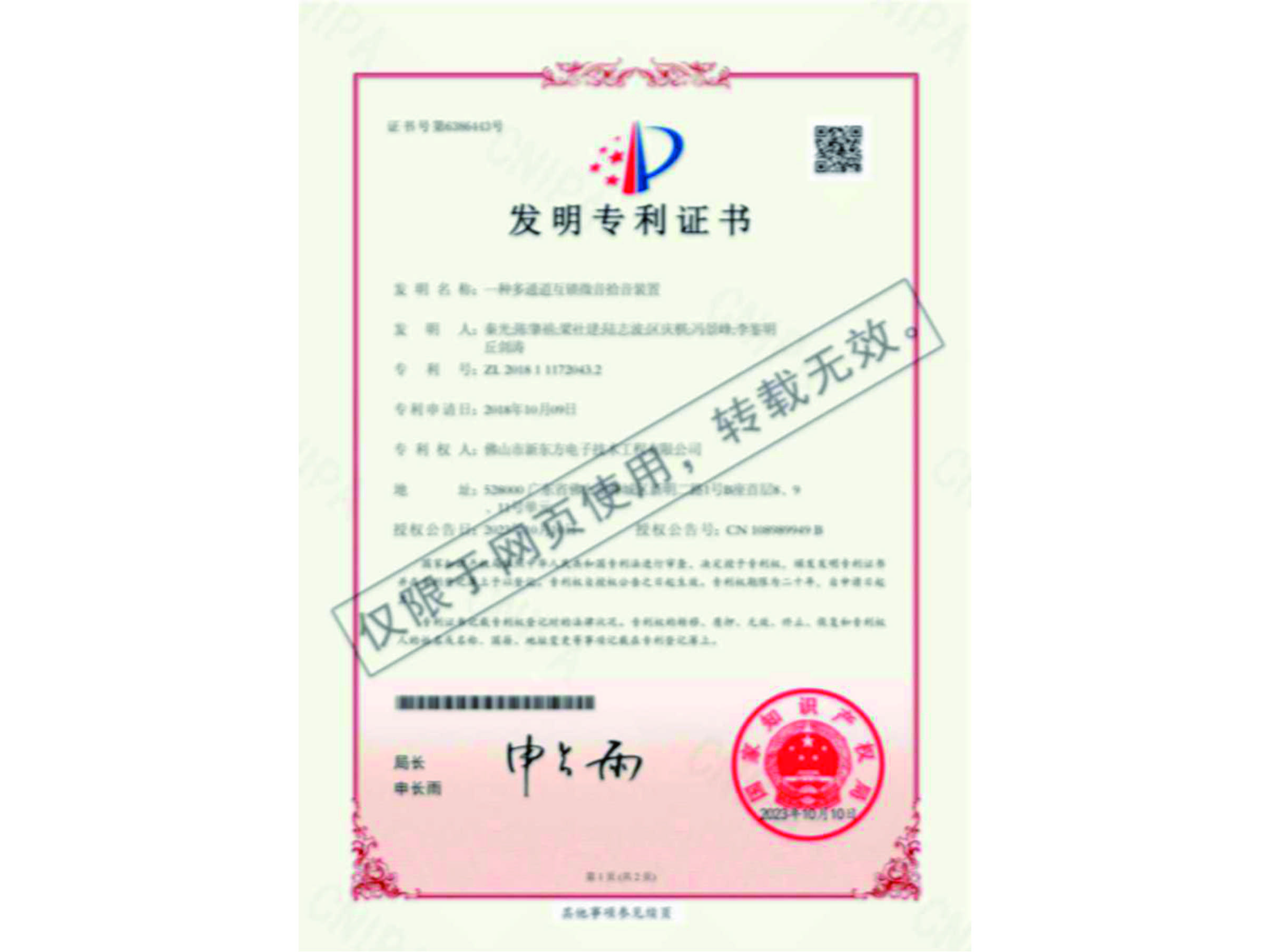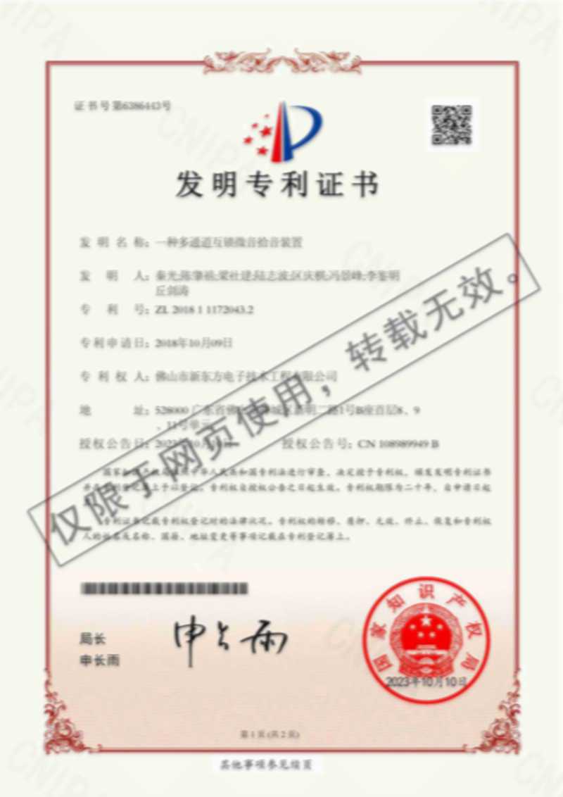 發明專利證書(一種多通道互鎖微音拾音裝置)