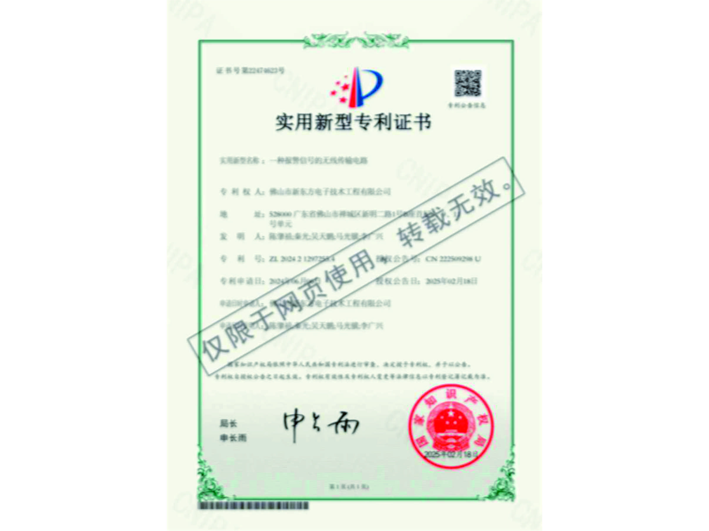 實用新型專利證書(一種報警信號的無線傳輸電路)